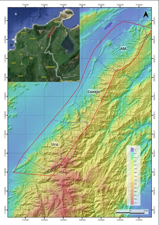 The Sierra Azul Copper Silver Project comprises of three districts: AM, Conejo and URU. Collectively the three contiguous districts stretch over 120-km in NNE/SSW direction (refer to Figure 1). Max’s land tenure at Sierra Azul includes 188 km2 of mining concessions and 1,141 km2 of mineral concession applications.