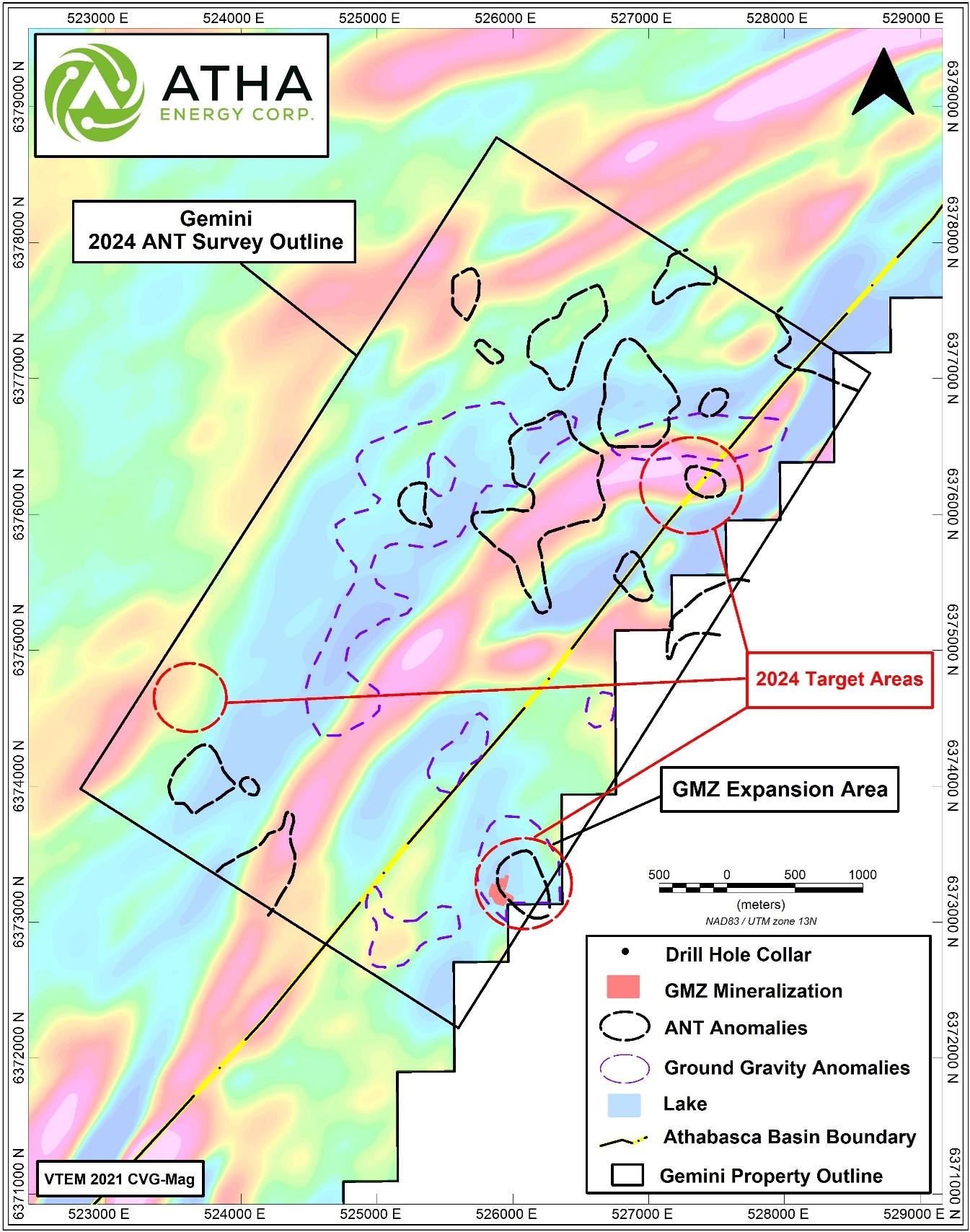 Troy Boisjoli, CEO added: “ATHA’s 2024 exploration program has already demonstrated that its exploration-at-scale approach can be successfully implemented across numerous projects and jurisdictions. We are excited to continue to advance that strategy with the kickoff of drilling at Gemini, while the Company continues its Angilak exploration program. At Angilak, our program was designed to expand the footprint of the mineralized system. The Company has fully achieved that objective and will be releasing radioactivity results for the remainder of the holes in early September. ATHA’s objective for its Gemini exploration program is similar, expansion at the high-grade GMZ Discovery, and testing of regional targets along highly prospective trends. From my experience, this is a property that has all of the indicators of a district scale Basin play, and our team is ready to unlock its value.”