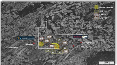 - Two highly prospective zones have been identified: one along strike with Adina East and another in the southeastern portion of the Liberty Property, where additional outcrops and boulders have been observed.