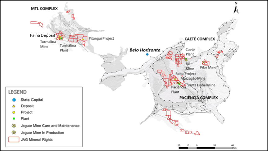 Figure 1. Location of the MTL mining complex, Turmalina mine including the Faina deposit, relative to Jaguar’s other operational areas in Minas Gerais, Brazil