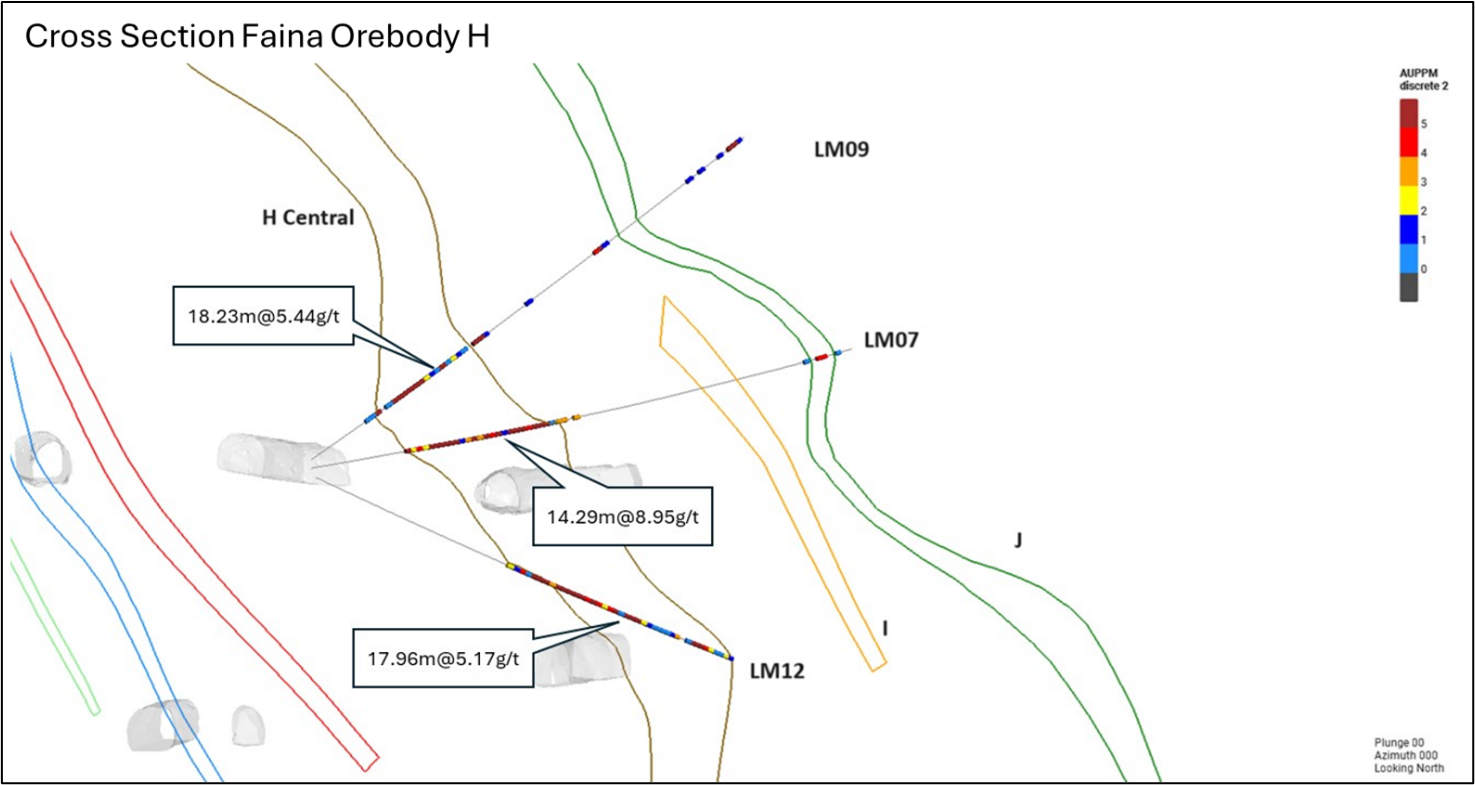 Gold mineralization is hosted within a series of six separate structurally and stratigraphically controlled mineralized lenses defined as lens E (undifferentiated chemical sediments), and lens F to lens J (meta-mafic rocks). Recent development and diamond drilling has focused on the H-Lens where high grade mineralization over true thicknesses > 10m have been intersected. This infill drilling and access development is enabling the geological team at Faina to refine the geological and structural model which is already informing the detailed designs for planned stope and production areas in the second half of 2024 and into 2025.