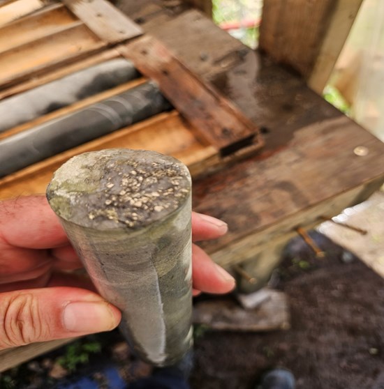 Many types of mineralized zones were intersected in this initial program. The Drill core from all the holes has now being logged and sampled with five large bags of mineralized drill core now having been sent to the AGAT Lab in Thunder Bay for analysis.