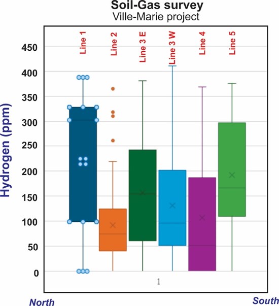 Extended Discovery: The anomalous natural hydrogen soil gas discovery now includes lines 4 and 5, expanding the scope and significance of our findings across the Ville Marie project area to over 9kms.