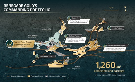 Renegade Gold Inc. is a growth focused company engaged in the business of acquisition, exploration and development of mineral properties located in the Red Lake Mining District of Northern Ontario. As part of its regional-scale consolidation strategy, the Company has assembled one of the largest prospective land packages in and around the Red Lake mining district in proximity to major mines and deposits, as well as along the Confederation Lake and Birch-Uchi greenstone belts. The 89,600 hectares prospective and diversified exploration portfolio has significant potential for gold and critical minerals on trend with the major structures hosting known gold occurrences in the Red Lake mining district today,