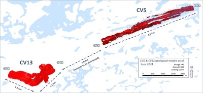 The Shaakichiuwaanaan MRE covers a collective strike length of approximately 6.9 km, drill hole to drill hole (4.6 km at CV5, and 2.3 km at CV13). Further, the CV5 and CV13 spodumene pegmatites are situated along the same geological trend, separated by approximately 2.9 km, and therefore this corridor is considered highly prospective for lithium pegmatite (Figure 3). This corridor remains to be drill tested; however, current interpretation of the collective dataset over the trend indicates a reasonable potential for connectivity of the pegmatite body(s). As such, given the similar mineralogy, geochemistry, host geological and structural trend, and close proximity to each other (< 3 km), the MREs for the CV5 and CV13 pegmatites have been presented as a consolidated MRE for the Project (Table 1). The MRE is further detailed below with respect to conceptual mining constraint shapes by resource location/name (Table 2).