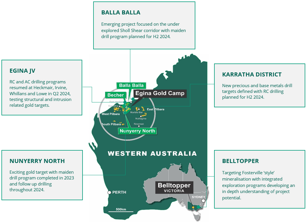 - Current focus is on delivering an exploration target for the network of high-grade historic and newly discovered gold reefs at Belltopper and growing the pipeline of conceptual high-value shallow and deeper targets.