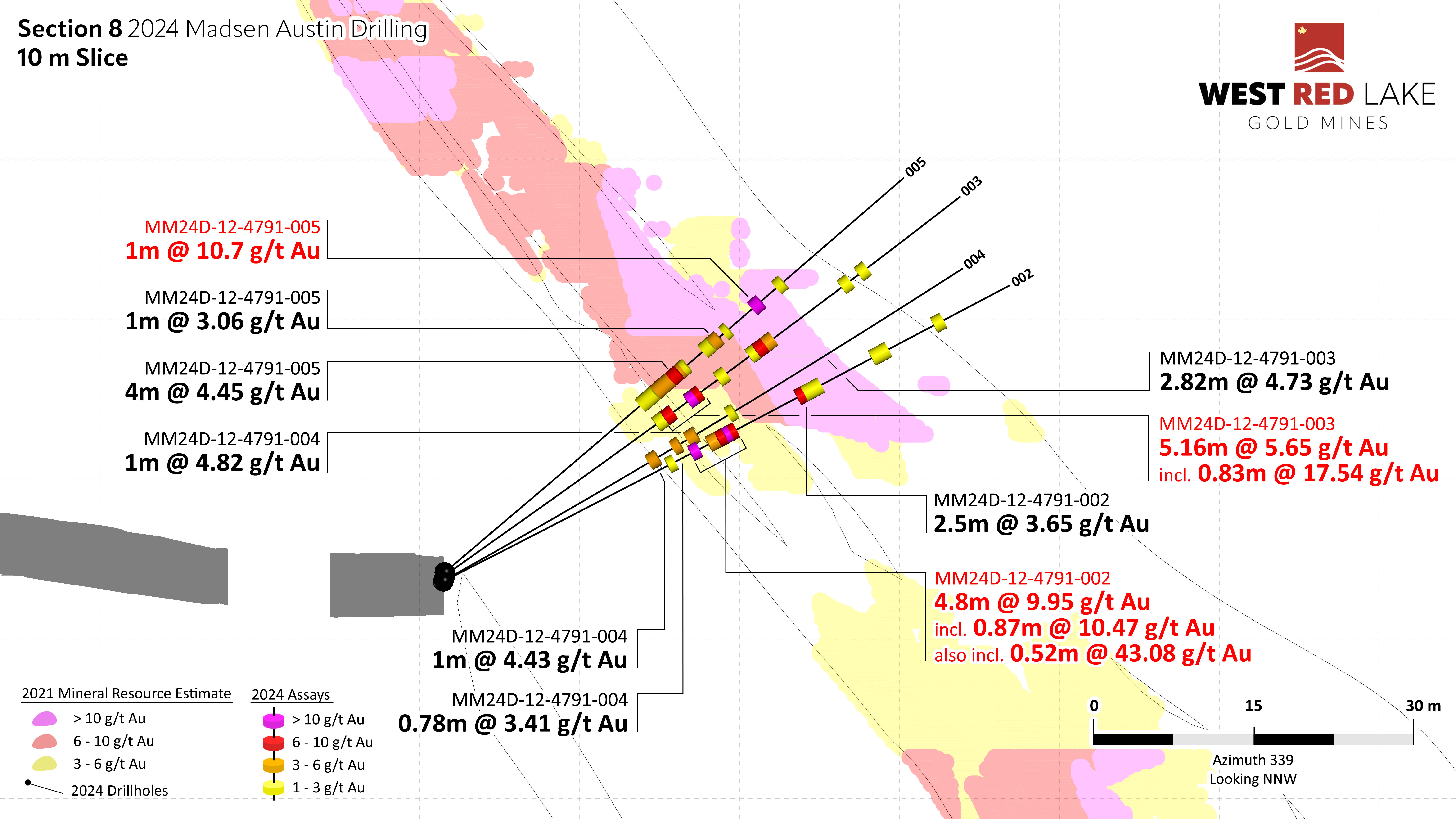 Shane Williams, President & CEO, stated, “The deeper portions of the Austin Zone are continuing to return very positive results as we advance the infill drilling programs and increase our confidence in these areas of the mine. Due to limited underground development, the two previous operators were only able to access portions of the Madsen deposit down to around 9 level. We are very excited to continue accessing deeper portions of the deposit which were historically mined during a period when gold was only valued at $20-40 per ounce. This resulted in very selective mining practices targeting just the core of the system that left behind a lot of mineralization that would be considered high grade by current standards. With gold prices now in excess of US $2,500/oz we are taking full advantage of that remnant material and see a lot of upside at depth in Madsen.”