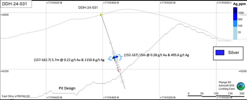 Hole DDH 24-031 was designed to expand the existing known shallow mineralization beyond the open pit margin at Oculto Northeast. Drilling encountered high-grade silver mineralization with 15.0 m grading 496 g/t Ag and 0.28 g/t Au, starting at a downhole depth of 152 m, within which was 5.7 m grading 1,151 g/t Ag and 0.22 g/t Au.