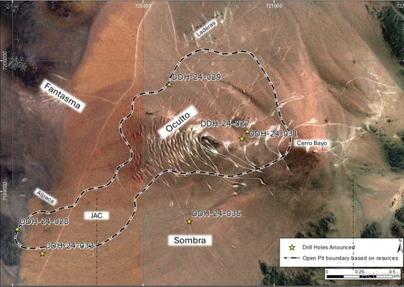 Hole DDH 24-036 was the first reconnaissance hole targeting a brand new zone, named the Sombra target, located approximately 500 metres to the southeast of Oculto and JAC, that is believed to run parallel to the existing Mineral Resources.