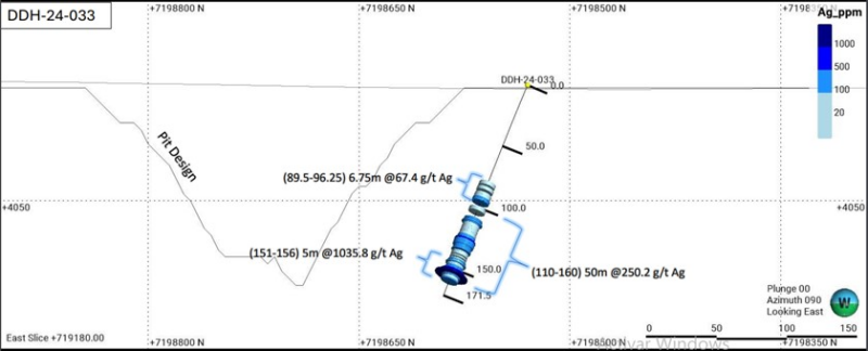 Hole DDH 24-033 was a step-out hole in the JAC southwest area that was drilled to extend the existing Mineral Resources beyond the current open pit boundary. Drilling intersected a broad zone of high-grade mineralization, with 50.0 m at 250 g/t Ag, starting at a downhole depth of 110 metres and included an interval of 5.0 m grading 1,036 g/t Ag