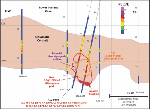 50.7 m of 4.52 g/t Pt, 4.38 g/t Pd, 0.99% Cu and 0.53% Ni(13.74 g/t Pt.eq1; 4.36% Cu.eq2) from 82.0 m downhole in Hole CL24-010, including
