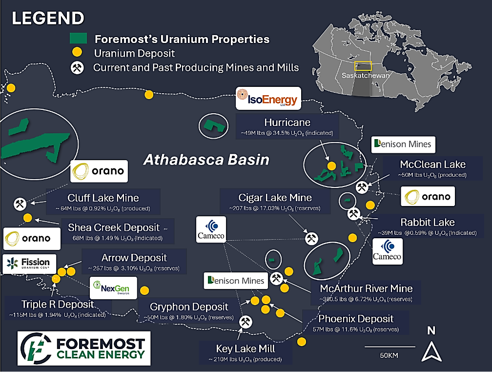 Fig 1. Map of Foremost’s Uranium Properties With Nearby Mills, Mines and Deposits