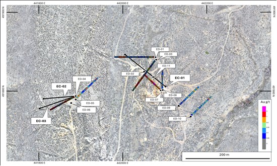 Targeting the 2023 ED-04 hole (32 meters of 3.98 g/t Au; see press release dated July 18th, 2023 located here), hole EC-02 was drilled to a depth of 158 meters and finished in mineralization but was unable to reach the target depth due to drilling difficulties encountered in a fault zone, believed to be an important mineralizing structure. Hole EC-03 targets the same horizon at a steeper angle than hole ED-04 and just east of EC-02 with the intent of crosscutting the mineralized fault zone intersected by hole EC-02 and continuing deeper into the mineralized fault zone. EC-03 has a target depth of 300 meters and is intended to determine if the open-ended zone of 3.98 g/t gold found in ED-04 represents a new high-grade zone or an extension of the mineralized zone in holes ED-07 and ED-01. EC-02 and EC-03 core is currently being processed.