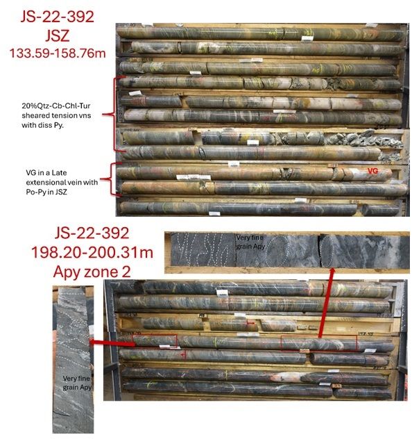 Figure 2 – Photograph of core from hole JS-22-392 showing (upper photo) sheared and altered zone with veining and VG, and (lower photo) altered zone with arsenopyrite mineralization.