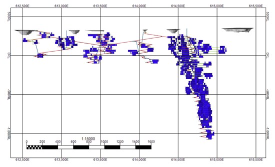 - Interpretation was initially made from cross-sections at intervals, and then completed in GENESIS, a modelling software, where selections of mineralization intervals were combined to generate mineralization wireframes. Envelopes are generally subvertical with various plunges.
