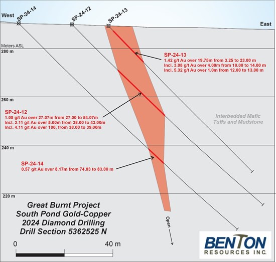 Benton Identifies Deep Electro-Magnetic Anomaly on the Great Burnt Copper Deposit and Continues to Intersect Significant Gold in Drilling at South Pond