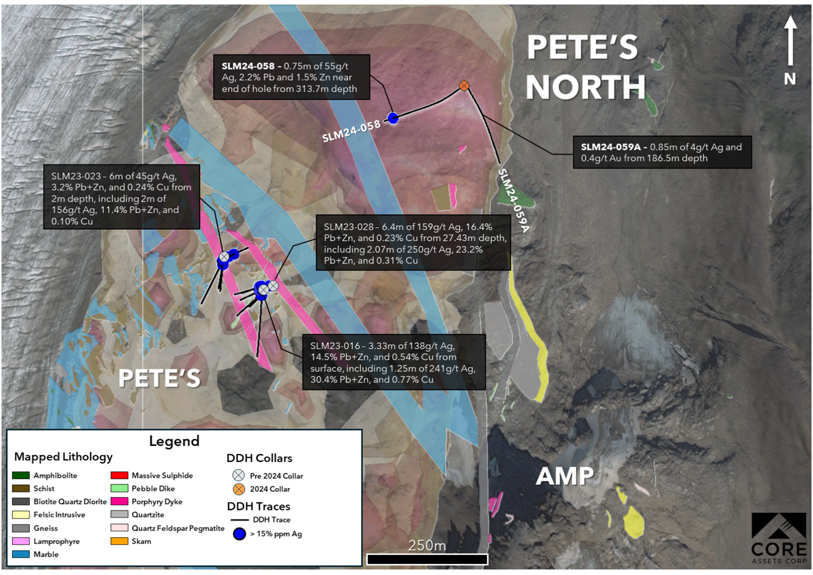 Core Assets’ President & CEO Nick Rodway commented, “Our longest and highest-grade massive sulphide zinc intercepts were obtained during the 2024 drilling season. We’ve also successfully tapped quartz-sericite-pyrite zones and potassically altered porphyritic intrusions carrying Mo-Cu-Ag signatures at depth at Sulphide City. This impressive system remains open at depth and in multiple directions for exploration and is primed for additional discoveries. We look forward to presenting our surficial assay data in the coming weeks, as well as new structural interpretations for the Silver Lime Project.”