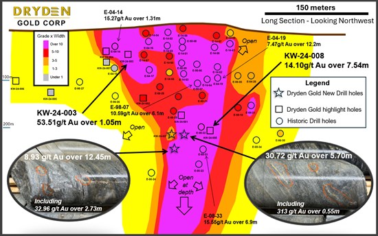 Hole KW-24-024 intercepted the mineralized zone at approximately 190 meters from surface and returned 8.93 g/t gold over 12.45 meters, including 32.96 g/t gold over 2.73 meters. In addition, this hole intercepted a hanging wall structure that returned 1.67 g/t Au over 2.75 meters, including 8.41 g/t gold over 0.43 meters. This is Dryden Gold’s deepest hole to date and is Dryden’s widest and most consistently disseminated high-grade intercept at Elora. A video summary of today’s results can be found here.