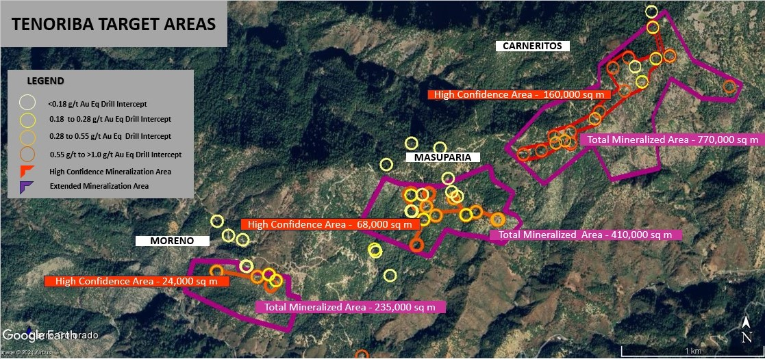 The Valesco Exploration Target study relied on thousands of gold-silver sample analyses from 55 diamond drill holes and a Google Earth image to interpret favourable surface geomorphology which was known to host gold-silver mineralization at Tenoriba from geological mapping and surface and drill sample results. The Target was identified for each of the three principal, gold-silver mineralized areas at Tenoriba that span a four-kilometre, east-west trend. From east to west, the mineralized areas include; Carneritos, Masuparia and Moreno.