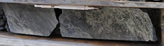 Figure 3. Drill Core DC24-105 of deformed massive sulphide at 27.5 m