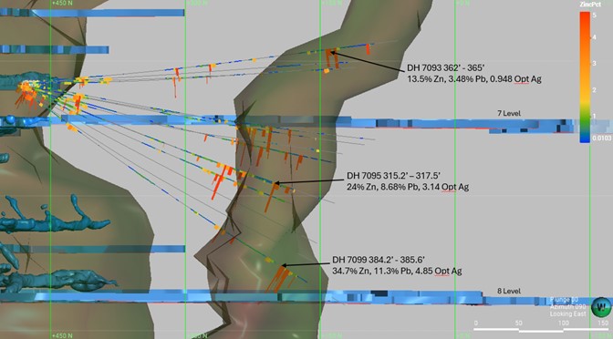 - Multiple high-grade polymetallic (Zn, Pb, Ag) zones intersected in the upper part of the mine, including: