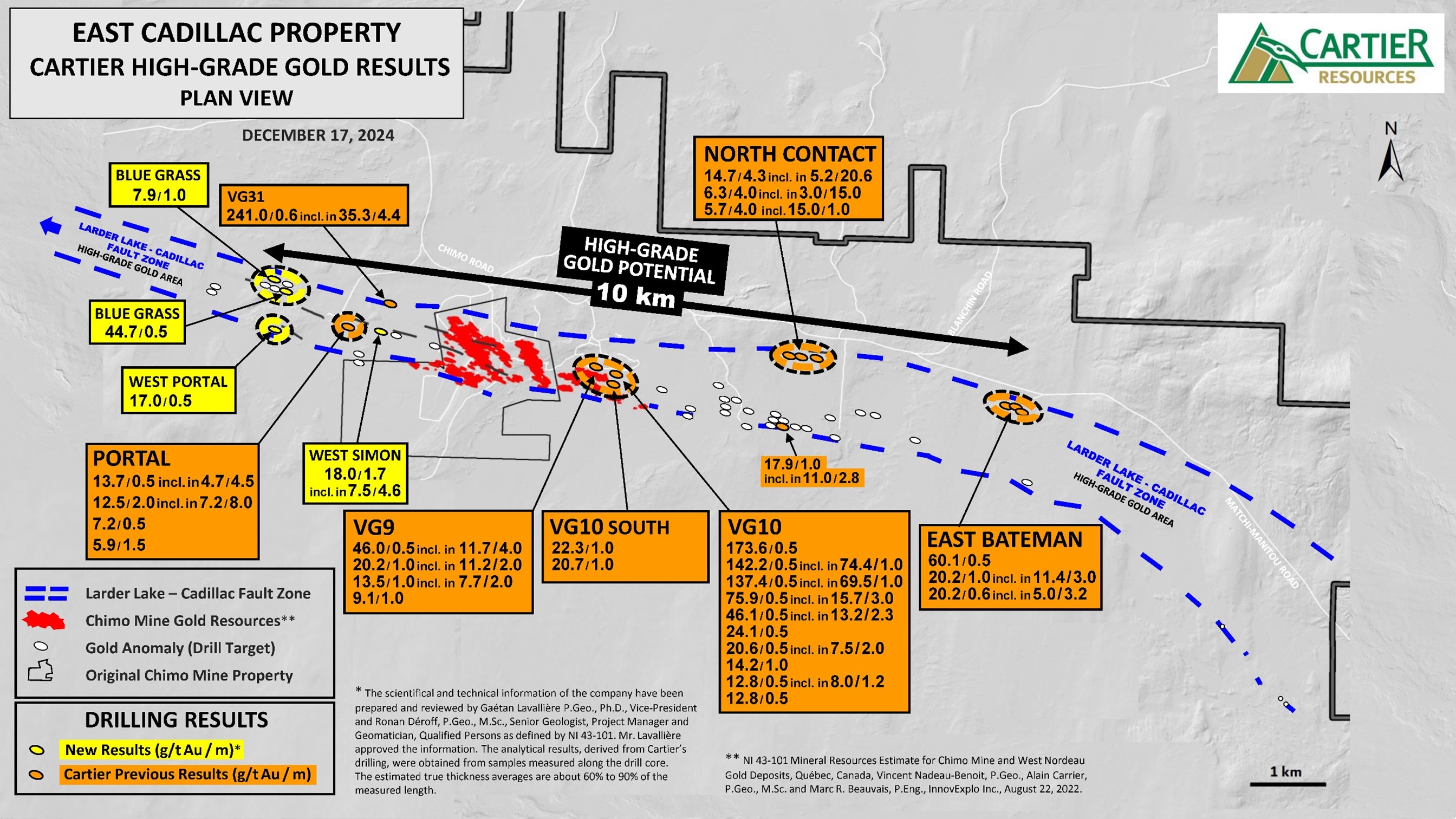 “The 10 high-grade gold areas discovered in 2024 are, located within 5 km on either side of the NI 43-101 resource estimate, in a prolific fault zone recognized for its mining potential and reported in a high gold price environment, provide the key elements required for rapid development of the East Cadillac asset,” commented Philippe Cloutier, President and CEO.