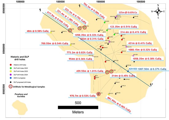 Figure 2: Aurora Project – Plan view showing historic drilling and drilling by DLP in 2022-2023-2024 with previously reported CuEq* values and A24-022 highlighted in blue.