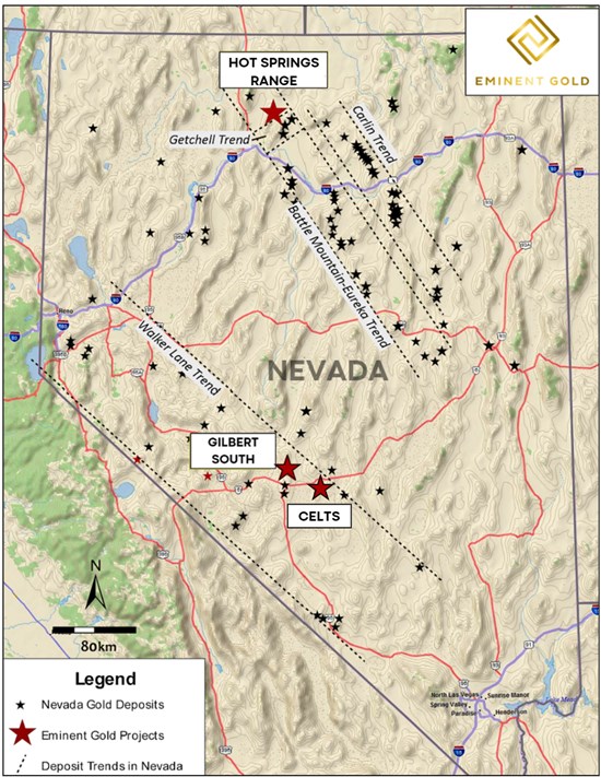 Eminent Gold is a gold exploration company focused on creating shareholder value through the exploration and discovery of world-class gold deposits in Nevada. Its multidisciplinary team has had multiple successes in gold discoveries and brings expertise and new ideas to the Great Basin. The Company’s exploration assets in the Great Basin include: Hot Springs Range, Gilbert South and Celts.