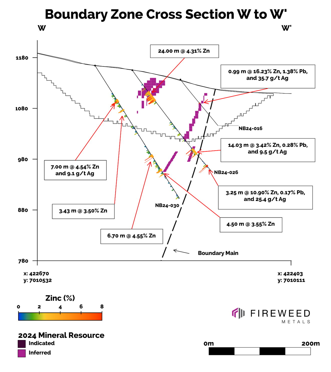 The holes in this release are step out holes testing vein, breccia, replacement, and stratiform to massive sulphides at Boundary Zone. Seven holes (NB24-019, NB24-020, NB24-026, NB24-027, NB24-028, NB24-030, and NB24-032 contain mineralized intercepts that are entirely outside of the 2024 MRE1 and represent growth potential outside of Fireweed’s current resource.