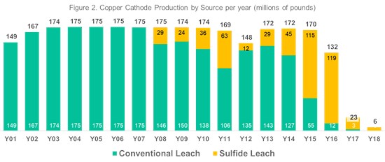 Figure 2 shows the LoM stacked annual copper production by conventional oxide leaching compared to sulfide leaching. Sulfide leaching makes up only 14% of the total LoM copper production and does not commence until year 8 of operations.
