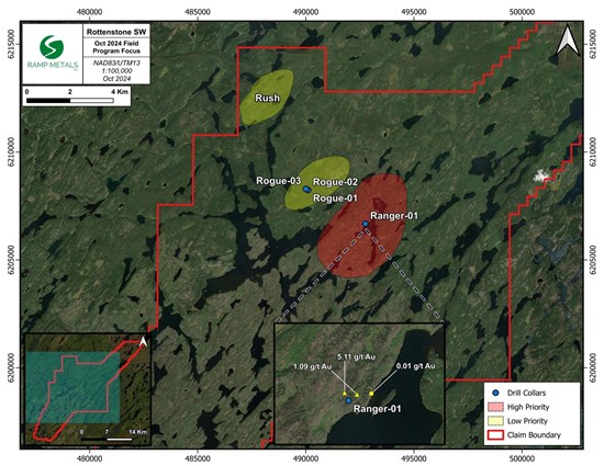 “The Rush target is an exciting new development as it highlights just how underexplored the Rottenstone domain is,” commented Garrett Smith, VP of Exploration at Ramp Metals Inc. “As we eagerly await the results from the October program, we are excited by the potential of a new deposit type to go along with our recent gold discovery.”