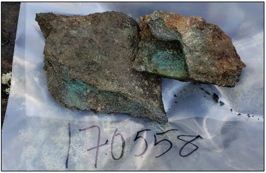 Figure 7: ‘Rush’ sample SRC416800 showing weathered ultramafic with malachite staining