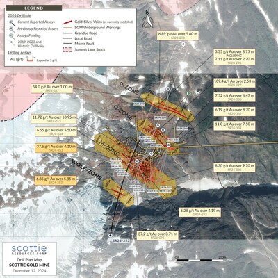 VANCOUVER, BC, Dec. 12, 2024 /CNW/ – Scottie Resources Corp. (“Scottie” or the “Company“) (TSXV: SCOT) (OTCQB: SCTSF) (FSE: SR8) is pleased to report new assays from its 2024 drilling of Scottie Gold Mine (SGM) and the discovery of a new zone, located south of the existing mine. The new assays related to a single drill hole drilled from the south of the mine, testing new concepts and targeting areas inaccessible to previously drilled orientations. The hole resulted in the discovery of the Wolf Zone, boasting an intercept of 6.85 g/t gold over 5.85 metres, and a strong N Zone intercept of 37.6 g/t gold over 4.1 metres. The Scottie Gold Mine Project, which includes the 100% owned historic mine and the adjacent Blueberry Contact Zone is located 35 kilometres north of the town of Stewart, BC, along the Granduc Road.
