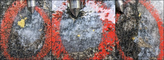 Figure 8: Photos of visible gold (VG) from drill hole PEX-24-197 from the regional exploration program in western Perron. Mineralization style shares similar features with other gold mineralization at Perron.