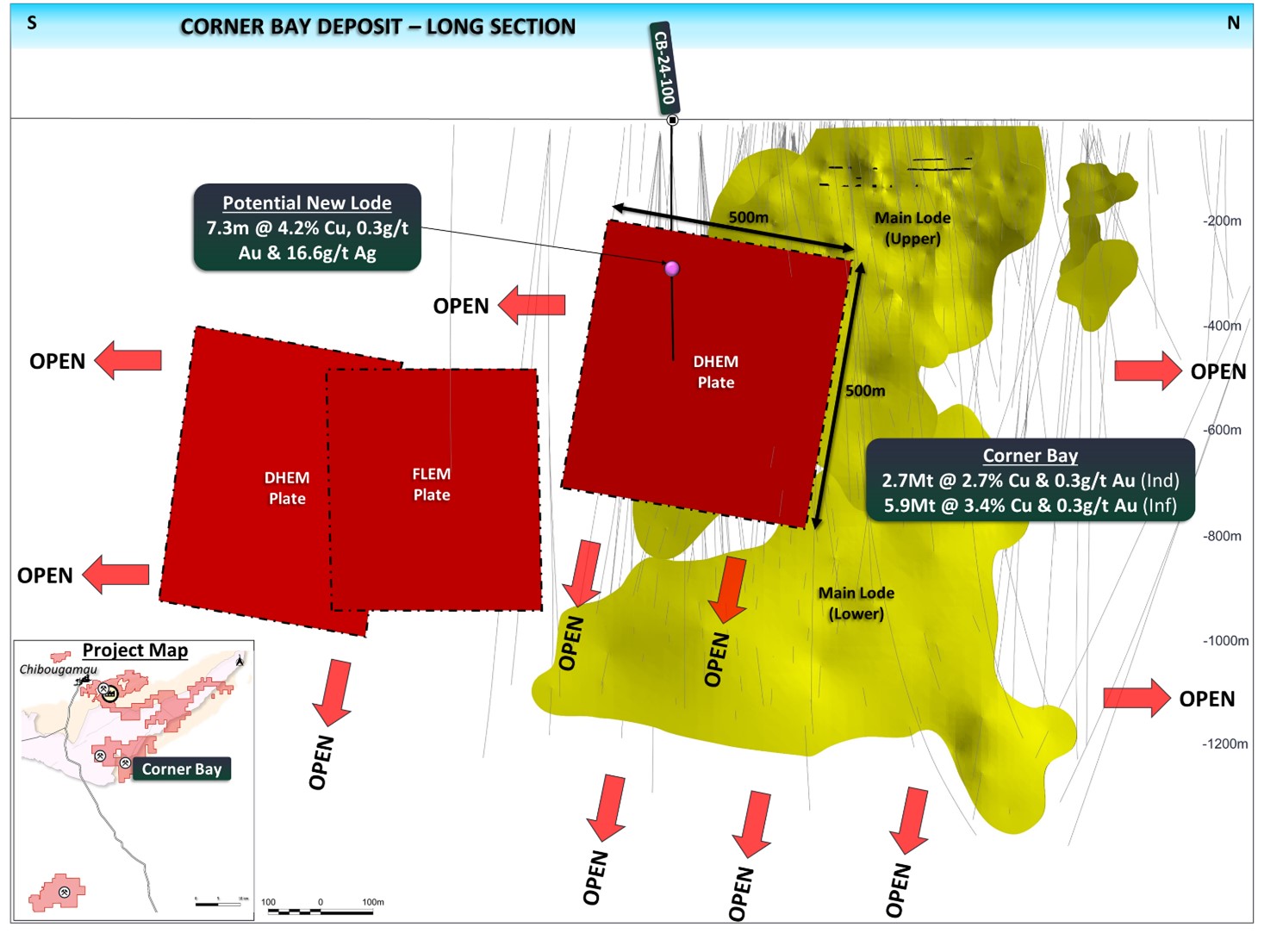 - The result reveals a potential new lode ~250m from Corner Bay, which is the primary deposit at the Chibougamau Project; Corner Bay has Indicated Mineral Resources of 2.7Mt at 2.7% Cu & 0.3g/t Au and Inferred Mineral Resources of 5.9Mt at 3.4% Cu & 0.3g/t Au1