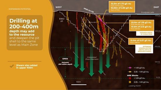 Results from the first hole (MMD-24-133), drilled to infill a gap in the resource model at the eastern end of the Southwest Zone under Snodgrass Lake, has expanded the width and increased the grade in a number of mineralized shears in the Southwest Zone with a combined intercept of 79.0m of 1.28 g/t Au from 27.0m, including several discrete higher-grade shear zones: