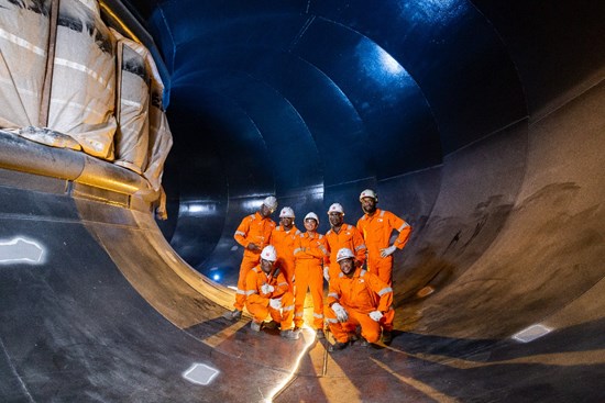 The blasting and painting team from Prezioso Congo SA inside the spiral case of the new 178-MW Turbine #5 at Inga II hydroelectric facility.
