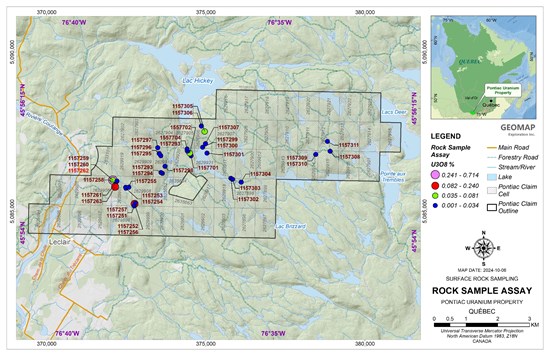 The Pontiac Uranium Property spans approximately 3,461 hectares and is located on NTS sheet 31F15, near Fort Coulange, Quebec. The site benefits from road accessibility via Highway 148 from Ottawa, supported by local infrastructure and a history of successful exploration. The Property is situated within the Grenville Province, characterized by various geological formations, including migmatized paragneiss and granitoid intrusions. The uranium-thorium deposit discovered in 1955 is hosted in pegmatite and granite, with mineralization detected in areas up to 0.11% to 1.0% U3O8 and up to 16.0% ThO2.