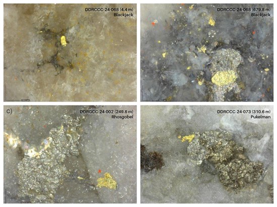 Figure 3: Examples of visible gold observed in Holes 71 and 72 at the Blackjack zone and in Hole 73 at the Pukelman intrusion.