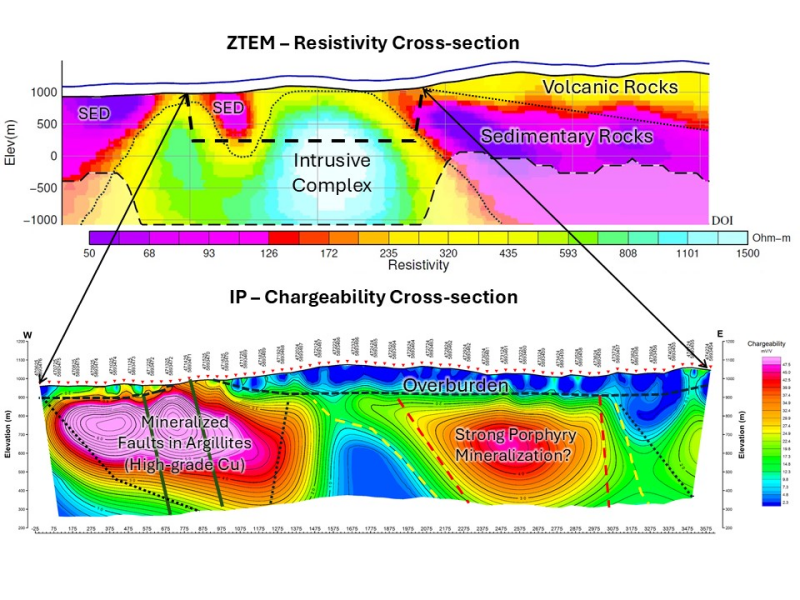 Figure 5: East-west orientated cross-section along UTM easting 5893450, looking north, of ZTEM resistivity (top) and IP chargeability (bottom). Note the data is at different scales, with the dashed box in the ZTEM cross-section indicating the approximate area of the chargeability data. The ZTEM data potentially indicates a strongly resistive intrusive complex (>600 Ohm-m), which extends to >2,000 m below the surface. A strong chargeability (>20 mV/V) response coincident with the intrusive complex is interpreted as potential porphyry-style mineralization. On the west side of the chargeability section, a very strong chargeability response (>40 mV/V) is coincident with a low resistivity response (<100 Ohm‑m) caused by outcropping graphitic argillites that host the high-grade copper mineralization encountered in surface sampling. The structurally controlled high-grade copper mineralization may be genetically associated with porphyry mineralization at depth or laterally.