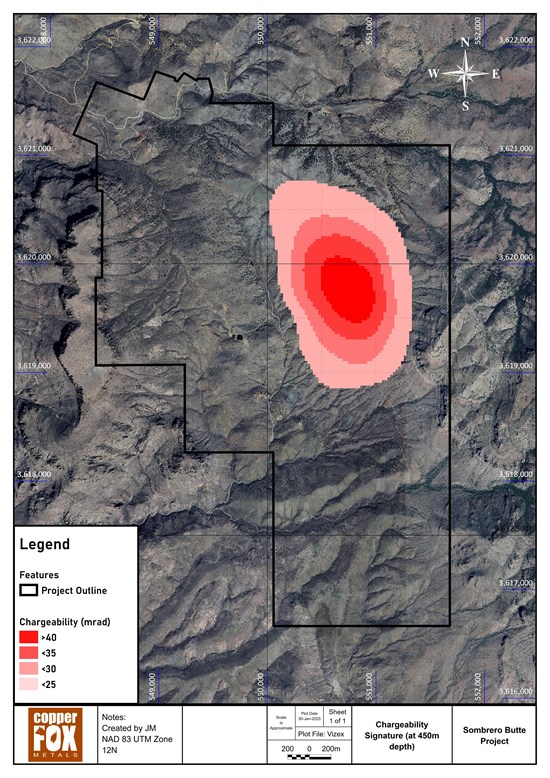 Elmer B. Stewart, President & CEO of Copper Fox commented “The geophysical program has mapped a large north-northwest trending body of anomalous chargeability that in places extends from surface to depths exceeding 800 meters (m) located along the interpreted Copper Creek granodiorite/Glory Hole volcanic contact. At surface, the chargeability anomaly exhibits a strong spatial correlation with the large zone of moderate to intense limonite (after pyrite) alteration/staining that has been mapped within the Laramide age Glory Hole volcanics. The chargeability signature is interpreted to represent the potential of a large body of sulphide mineralization at depth and further supports the potential for a porphyry copper system underlying the Sombrero Butte project.”