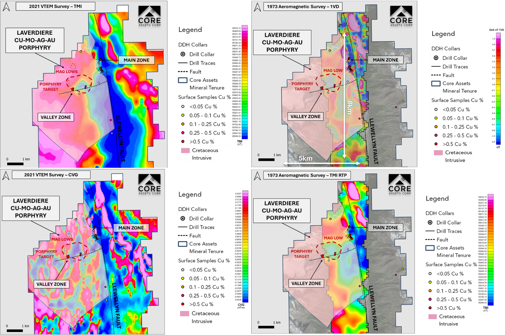 Core Assets’ President & CEO, Nick Rodway commented “The Laverdiere Copper Project contains 5km x 8km of highly prospective, under-explored Cretaceous copper porphyry situated at the tip of the Stikine Terrane in northwest BC. Mineralization at the newly defined Valley Zone surrounds an impressive donut-shaped magnetic low geophysical anomaly measuring approximately 1km by 1.2km across and is interpreted as a probable high-grade porphyry center. The Laverdiere Copper Project is drill-ready and easily accessible. Prospectivity studies are continuing in anticipation of future exploration programs.”