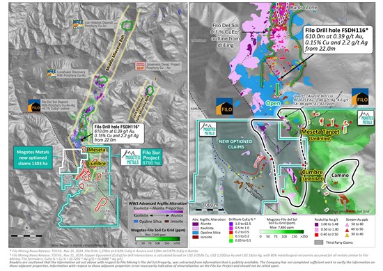 Toronto, Ontario–(Newsfile Corp. – February 18, 2025) – Mogotes Metals Inc. (TSXV: MOG) (FSE: OY4) (“Mogotes” or the “Company“) announces the start of a field reconnaissance program and initial positive field observation of significant areas of previously unsampled breccias and vuggy silica alteration from the recently optioned CMP claims, adjoining Filo Corp.’s Filo Del Sol Cu-Ag-Au deposit and now part of the Mogotes Filo Sur project within the prolific Vicuña copper-gold-silver district straddling the Chile / Argentine border.