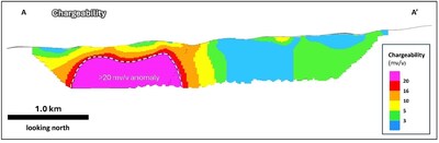 - The M5 chargeability-high anomaly is coincident with significant magnetic and EM anomalies which have never been drill tested