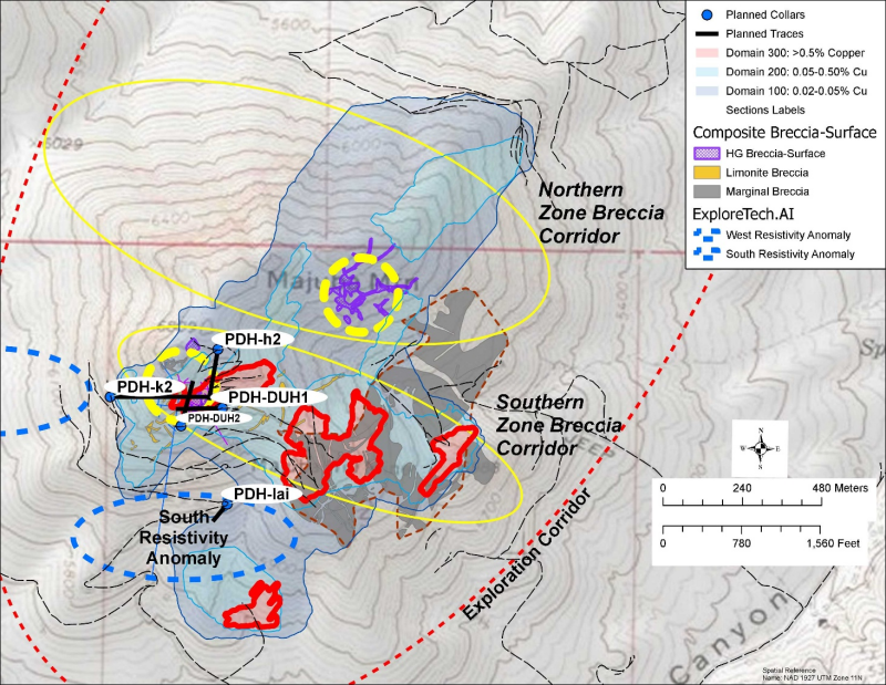 The 2025 Drill Program is planned for 4,400 feet (1,340 meters) of core drilling. A minimum of 2,600 feet (792 meters) will be completed and the contract does not have a maximum drilling requirement, allowing for flexibility in the execution of the project. Planned drill holes (“PDH”) are shown on Figure 1 and Table 1. Four of the planned drill holes are follow-up and extension holes to the 2024 drilling. A fifth hole has been added to the program to drill test the high-potential Southern Resistivity Anomaly generated by the ExploreTech AI program.