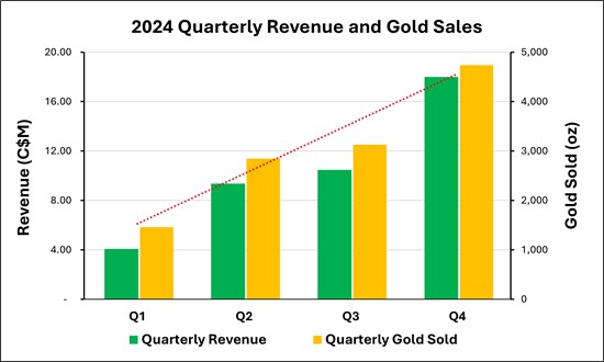 Figure 1. Tuvatu Quarterly Revenue and Gold Sales, 2024. Quarterly revenue and gold sales have consistently increased quarter-over-quarter at Tuvatu since pilot plant commissioning was complete in Q1 CY2024.