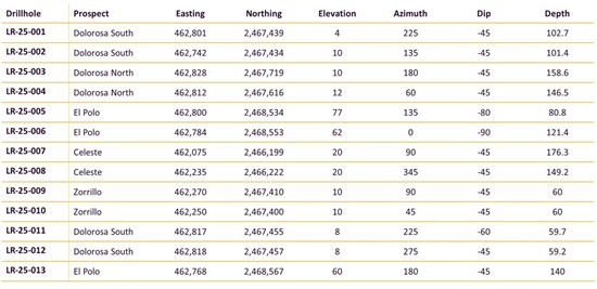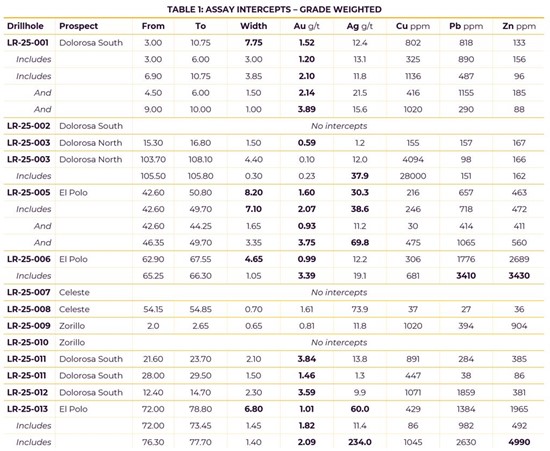 LR-25-003 intersected a 4.4 m fault structure returning 0.1 g/T Au, 12 g/T Ag and 0.41% Cu, including 0.23 g/T Au, 37.9 g/T Ag and 2.8% Cu over 0.3 m. LR-25-004 is currently interpreted to have drilled the footwall to the target, intersecting anomalous gold and silver mineralization with a best assay of 0.35 g/T Au and 2.0 g/T Ag over 2.6 m. More drilling is needed to determine target geometry and thickness and test continuity with the Dolorosa South prospect. (Table 1).