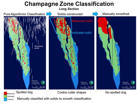 Figure 6: Image to display the classification process for the Champagne Zone. Industry standard for Mineral Resource classification that was developed by Newmont for use in Leapfrog Edge.