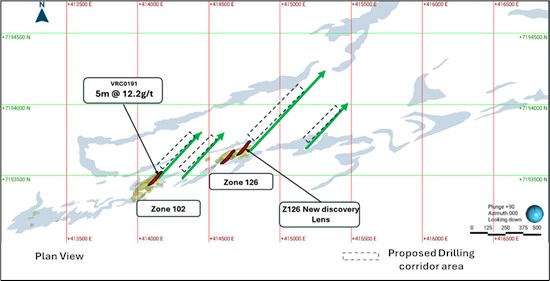 Figure 2 Plan view: Initial planned drilling targeting high grade corridors in and around the Zone 126 high grade trend.