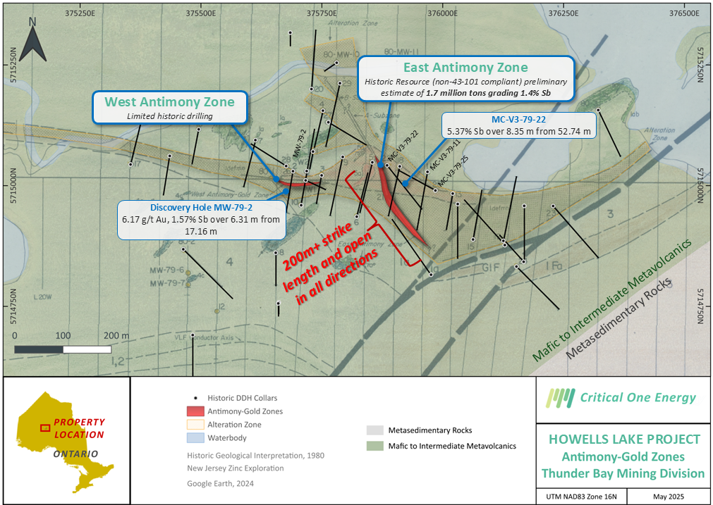 TORONTO, May 14, 2025 (GLOBE NEWSWIRE) — Critical One Energy Inc. (formerly Madison Metals Inc.) (“Critical One” or the “Company”) (CSE: CRTL) (OTCQB: MMTLF) (FSE: 4EF0) is pleased to announce that the Company has discovered significant antimony, including an interval in drill hole MC-V3-79-22 that assayed up to 75% antimony within core internal of 5.37% antimony over 8.35 metres, as well as gold assays in the extensive collection of historical records of the Howells Lake Antimony-Gold Project (“Howells Lake Project”) announced in its May 1, 2025 press release.